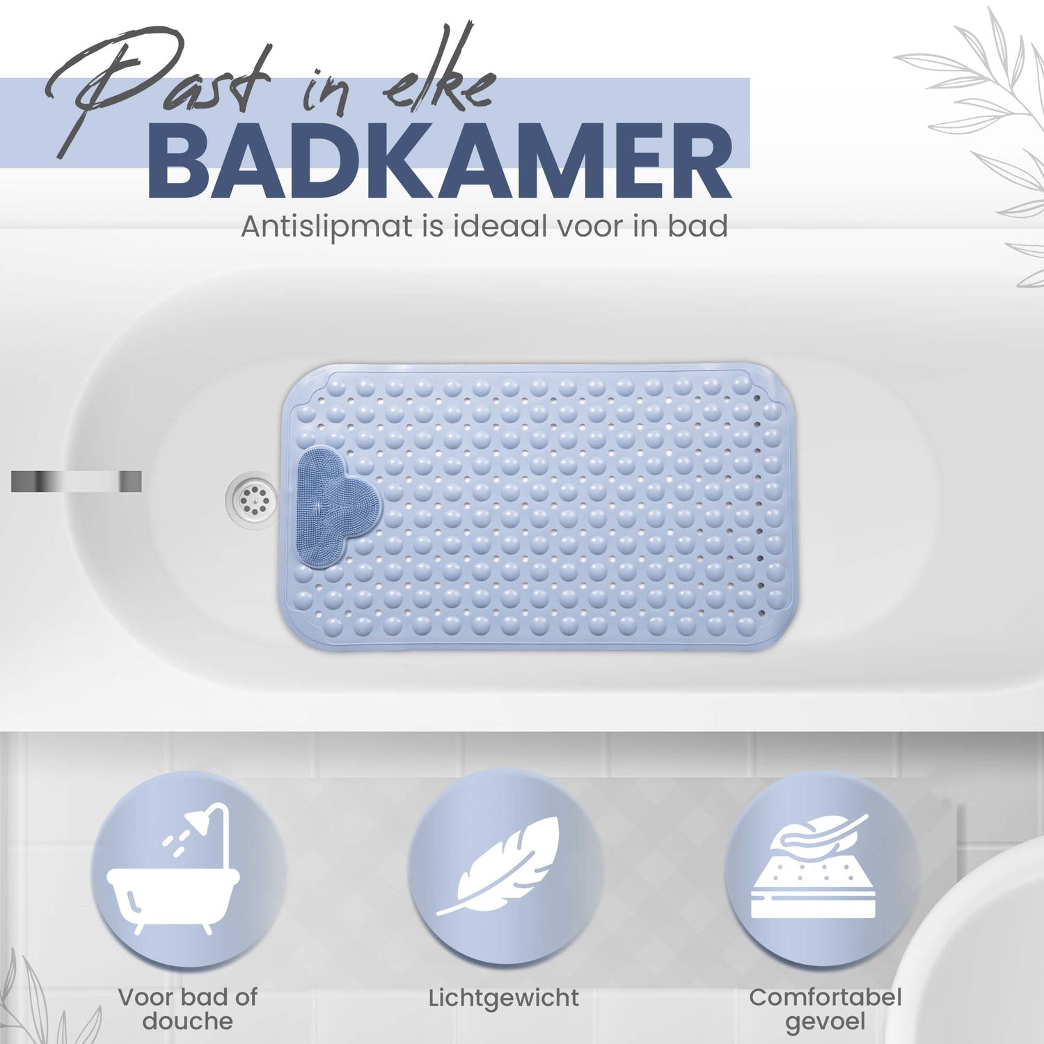 Op zoek naar een comfortabele douchemat die zorgt voor extra grip en veiligheid in de douche? Dan is deze blauwe douchemat met antislip en zuignappen de perfecte keuze. Met een afmeting van 40 x 70 cm past deze mat in de meeste douches en badkuipen.